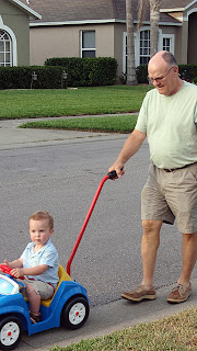 Nelson tries out his new tricycle from Gigi and Papa John with some help from Aunt Anna in Nanny's driveway.